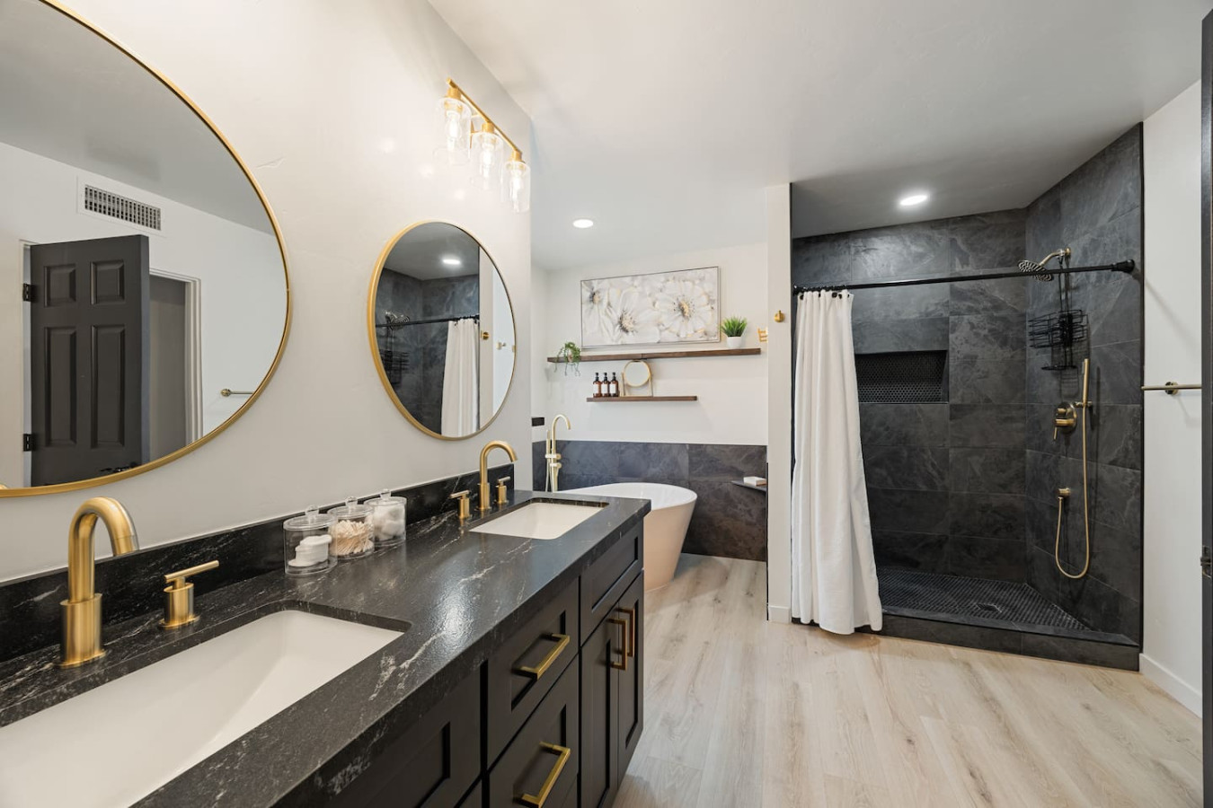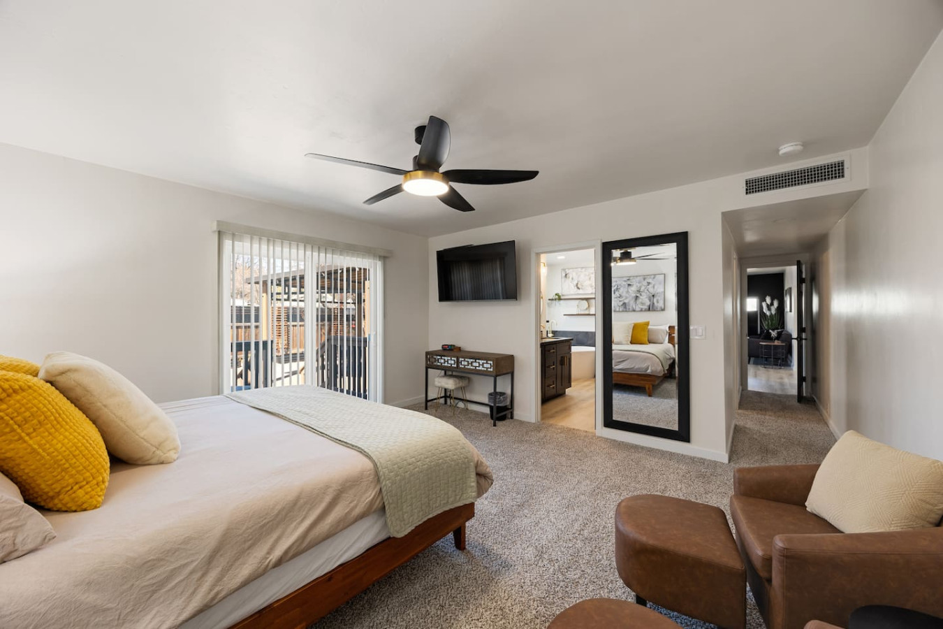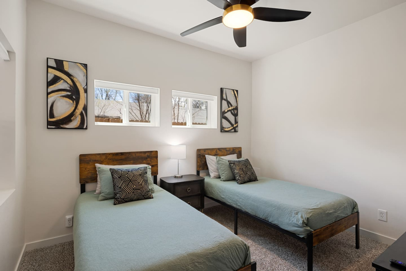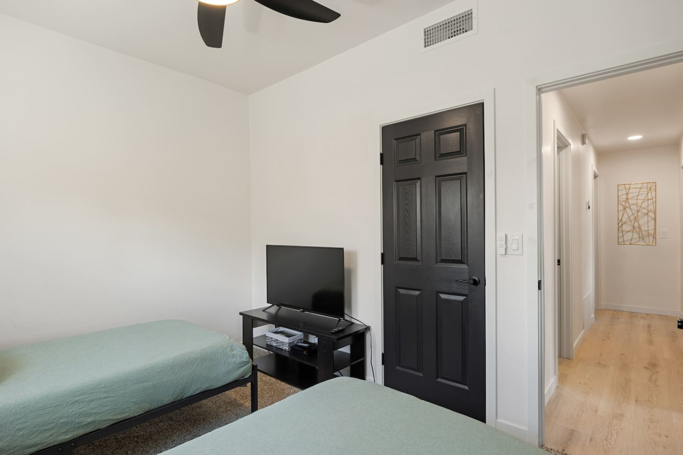 This sleek new modern style rental consists of three bedrooms! A king bed in the master, a queen in one guest room and two twin beds perfect for the kids in the other. Also includes two full bathrooms (one en suite), a spacious living room, beautiful new kitchen, a complimentary washer and dryer, a fenced backyard, and a spacious parking area!