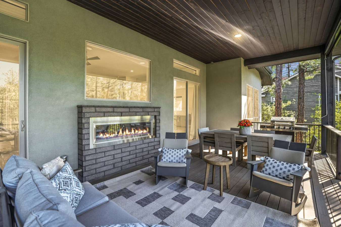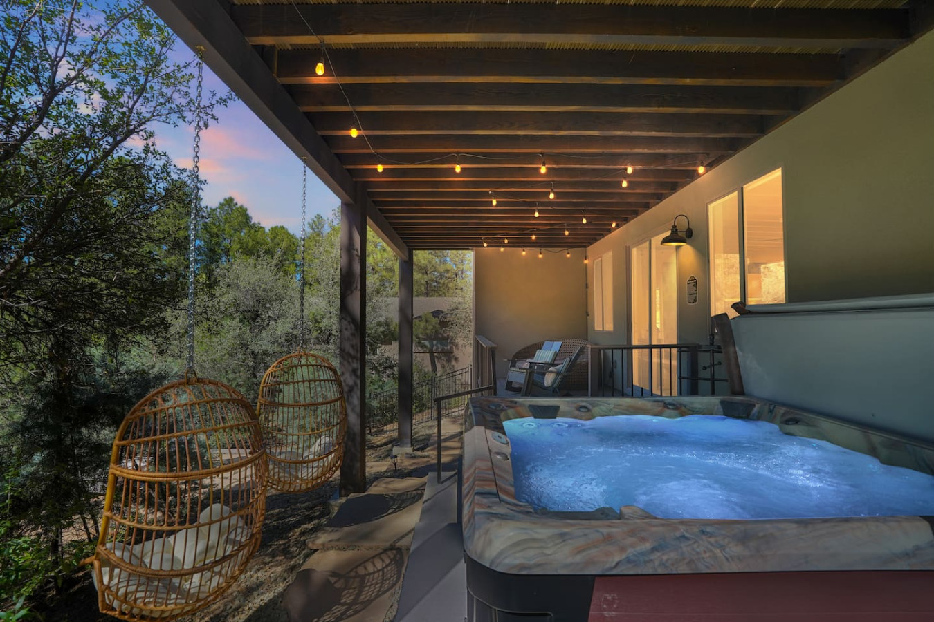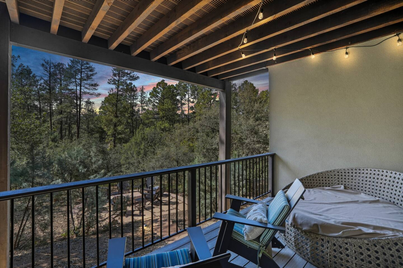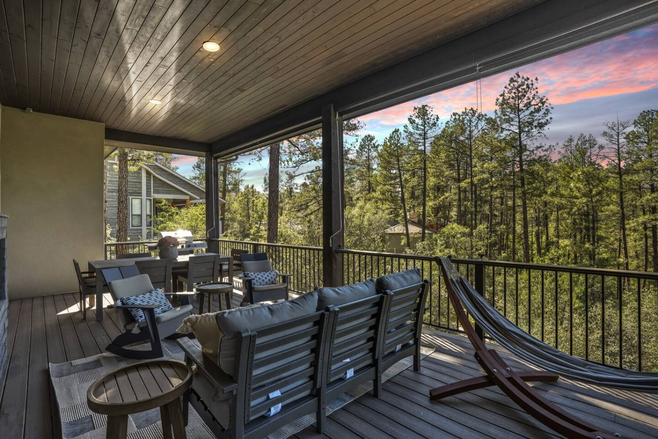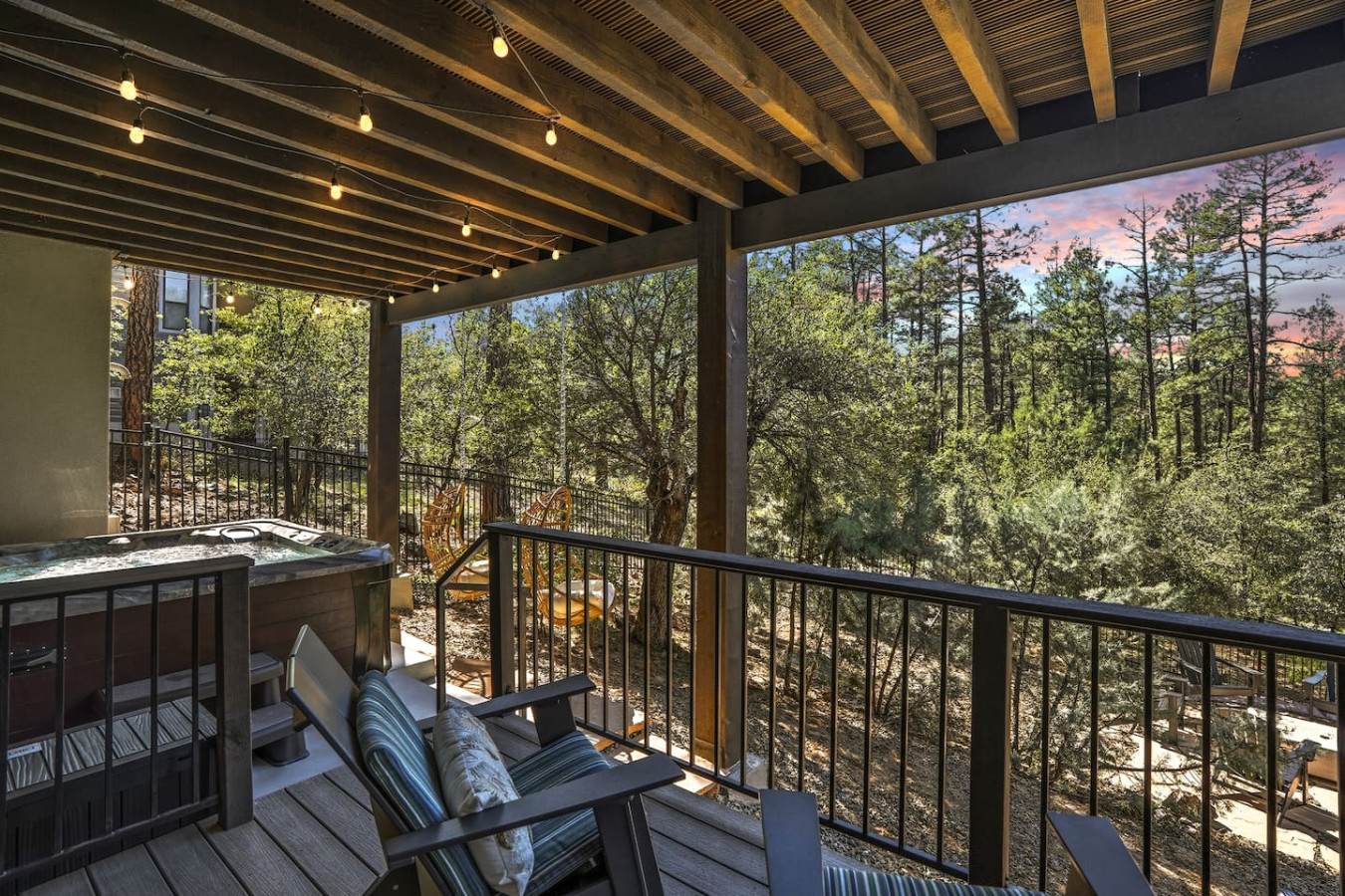 Outdoor Oasis: Step outside to your private paradise. Soak in the hot tub under a canopy of stars (pure bliss after a day of hiking or meetings), or gather around the fire pit lounge to share stories under the pines. An expansive upper covered deck boasts a dining table, cozy sofa, hammock, and twinkle lights – an idyllic spot for morning coffee or sunset dinners with a forest backdrop.