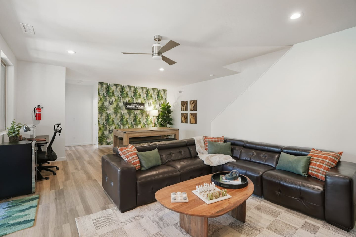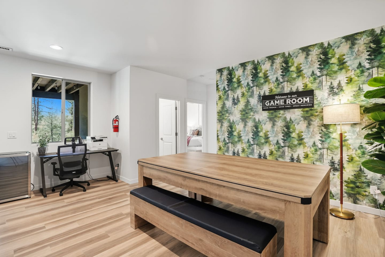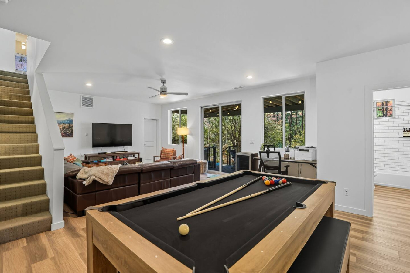 Two Living Areas: Relax together or find your own space. Enjoy the stylish main-level living room with a contemporary LED gas fireplace and floor-to-ceiling woodland views. Downstairs, kick back in the second living area game room – featuring a pool table, ping pong, and board games – perfect for family fun night or corporate team-building.